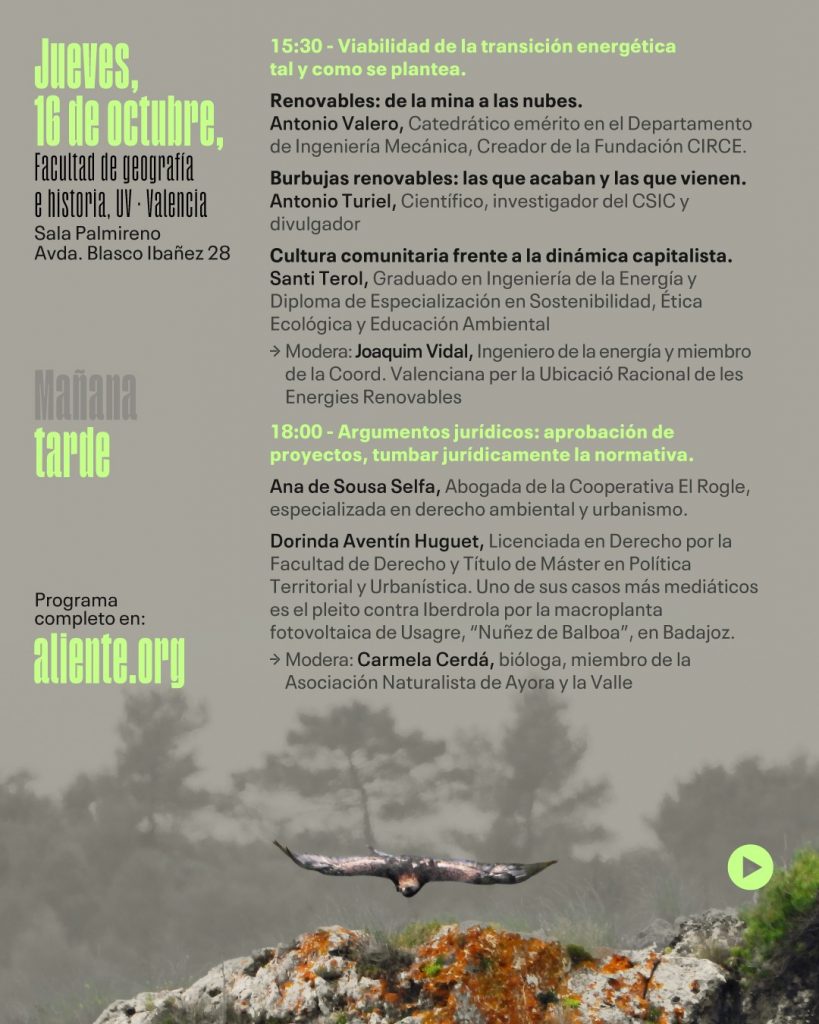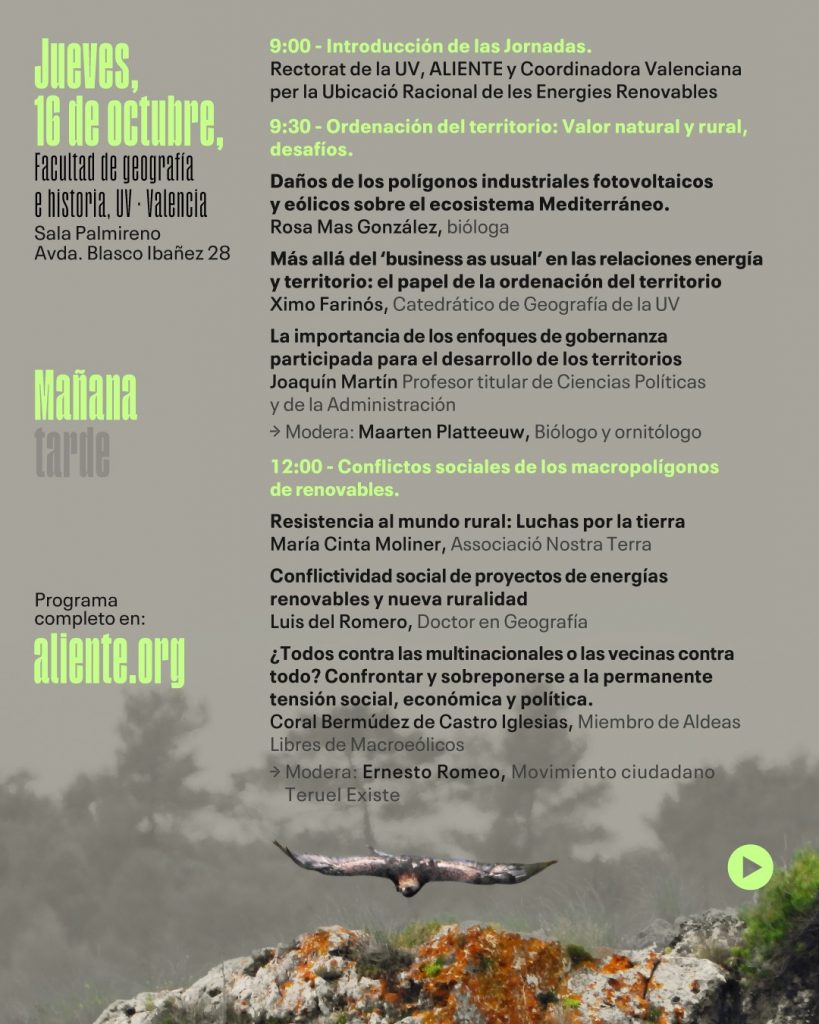 La Alianza Energía y Territorio -ALIENTE- junto a la Coordinadora Valenciana per la Ubicació Racional de les Energies Renovables y la Facultad de Geografía e Historia de la Universitat de València, organizan estas IV Jornadas “de Escucha a la Ciencia y al Territorio” con el objetivo de realizar un análisis en profundidad del actual proceso de transición energética y del despliegue de energías renovables en nuestro país. Con el propósito de conseguir una transición energética justa y democrática, es importante identificar los problemas que dicho despliegue, masivo y desordenado, está causando en el mundo rural, en el paisaje y en la biodiversidad, así como proponer soluciones a los mismos. Así, se pretende hacer oír la voz de la ciencia y de los territorios: de científicos, técnicos, asociaciones, plataformas, y de ciudadanos de la España rural y la mal llamada “España vaciada”.