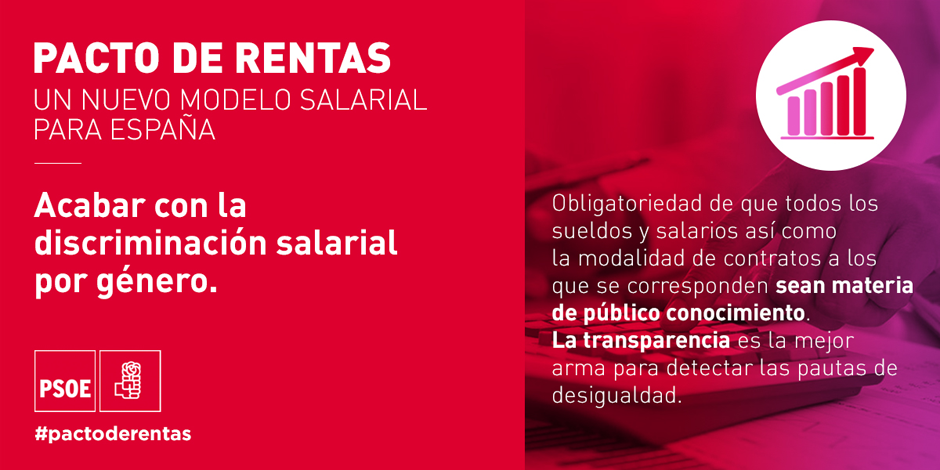 • Transparencia para acabar con la brecha salarial de género Respecto a la brecha salarial de género, defendemos y apostamos dentro de este marco de un nuevo modelo salarial hacia un nuevo pacto de rentas, la redacción de una Ley de Igualdad Laboral que tenga en cuenta desde la incorporación, las condiciones laborales y de remuneración y en consecuencia de las pensiones, la mejora de la cualificación, hasta la reincorporación de las mujeres al mundo laboral, entre otras medidas. Asimismo, proponemos mayor transparencia estableciendo a nivel de empresa la obligatoriedad de que los sueldos y salarios de todos los empleados, junto a la modalidad de contratos a los que se corresponden, sean materia de público conocimiento. La transparencia es la mejor arma para detectar las pautas de desigualdad salarial entre hombre y mujeres que aún existen y que hoy se disfrazan por la diversidad de contratos (tiempo parcial/tiempo completo, etc...)/p>